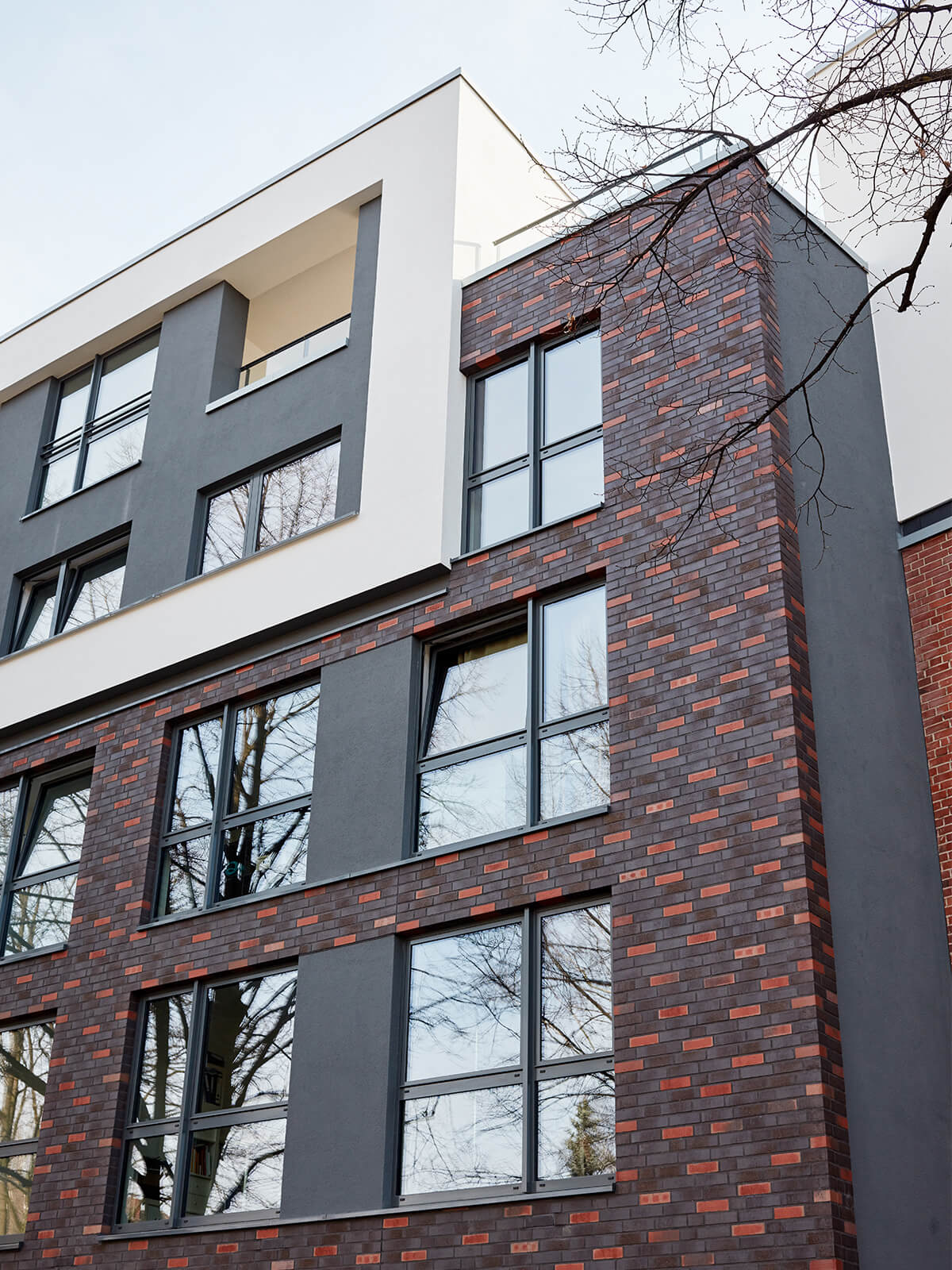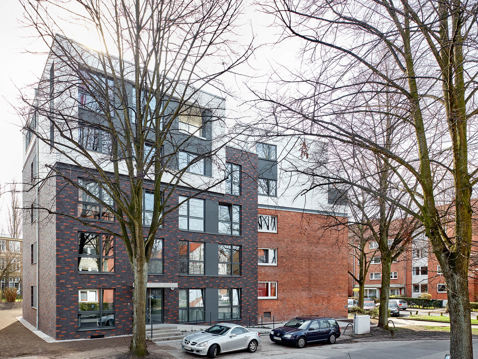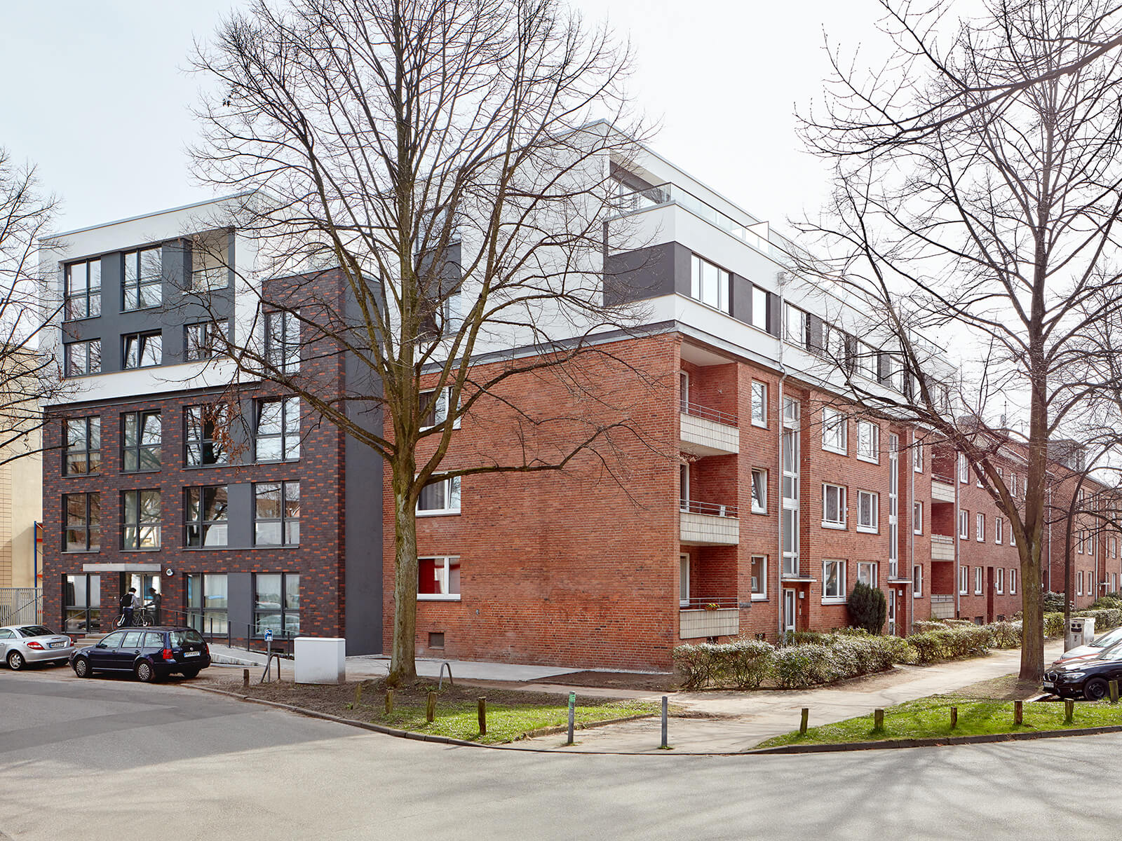 Wir haben auf dem Grundstück Langenrehm 16/18, Ecke Stückenstraße in Hamburg ein Mehrfamilienhaus um 2 Geschosse aufgestockt und einen 5-geschossigen Neubau inklusive Keller neu errichtet. Beide Gebäude wurden im Eckbereich der Straßen miteinander verbunden, und zusätzlich haben wir das Bestandsgebäude gartenseitig mit Balkonen als vorgeständerte Stahlkonstruktion ergänzt. Die neuen Dach-/Staffelgeschosse auf dem Bestandsgebäude wurden u.a. über den Aufzug und das Treppenhaus des Neubaus erschlossen. Für die Aufstockung haben wir sowohl Mauerwerkswände im Dachgeschoss als auch das bestehende Satteldach abgebrochen.Unsere Leistungen als Generalunternehmer umfassten neben den Abbruch- und Erdarbeiten sämtliche Beton-, Stahlbeton- und Maurerarbeiten. Im Bereich des Bestandsgebäudes haben wir zudem die Fundamente durch Fundamentunterfangungen verstärkt, Kelleraußenwände nachträglich abgedichtet und Sanierungsarbeiten am Verblendmauerwerk ausgeführt. Auch die Dach- und Abdichtungsarbeiten, Estrich- und Putzarbeiten gehörten zu unserem Leistungsumfang. Die Balkone und Vordächer haben wir in unserem eigenen Betonfertigteilwerk produziert. Herausforderungen wie eine komplexe Baustellenlogistik (u.a. Lagerflächen, Kranstandort) konnten wir erfolgreich meistern.